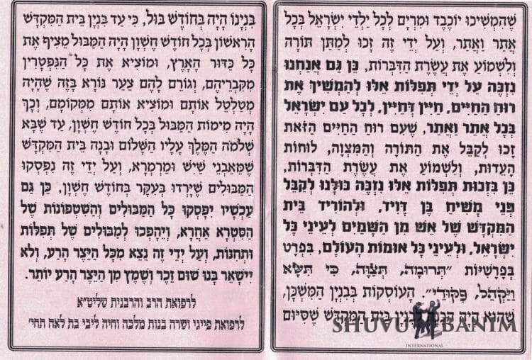 Ribonu shel Olam, Master of the World, give me the merit of distributing the prayers of the Rav to every single house and home, and to every single place and location, and to every single neighborhood and locality. And to every single Jew, so that it shouldnât come about that a Jew should lack some prayer, chas vâshalom (God forbid).And on this (i.e. distributing the Ravâs prayers) depends the whole geula, until Moshiach ben David will be revealed, by way of the Ravâs prayers.
