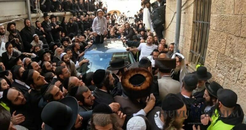 Within a few minutes Rechov HaHoma HaShlishit fills up with thousands of Chasidim and followers of the Rav shlit”a: the new with the old, Chareidi Litvaks alongside secular, knitted kipas alongside Chasidim… All of them gathered and came, amongst them even those who had never merited to see the Rav shlit”a. Thousands upon thousands flowing in from all over Israel, from Metula (the northmost city) to Eilat (the southernmost city) to gaze at the radiance of the holy countenance of the true Tzaddik of the generation and to welcome him.
