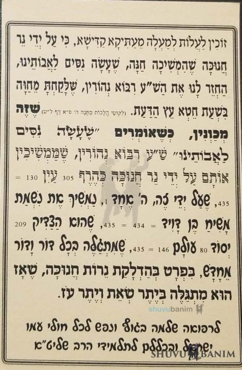 Ribbono Shel Olam – Master of the Universe, Who can do everything, behold, I am now before lighting the candle of the first night of Chanukah, for the Chanukah candles are 36, opposite the 36 kritiot (sins punishable by spiritual excision), opposed the 36 Tzaddikim who are in each and every generation, that anyone who does not believe in them is liable to karet, as it says, “That soul shall be cut off from its people.” For the flame of the Chanukah candle, which is taken from the prayer of Channah, Channah Ku (חנה כו), as it says, “Channah prayed about Hashem,” that through the Chanukah candle, we merit to ascend to Atika Kadisha (the Holy Ancient One), Holy of Holies, Hidden of All, Concealed of All, for through the Chanukah candle, we merit to ascend above Atika Kadisha, for through the Chanukah candle which Channah drew down, the One Who performed miracles for our forefathers returned to us the 370 multitude lights which You took from Chava (Eve) at the time of the sin of the Tree of Knowledge, that this is what is intended when we say, “Who performed miracles for our forefathers,” the 370 multitude lights which we draw through the Chanukah candle in the blink 305 of an eye 130 = 435, that through this, Hashem Echad 1, we will draw the soul of Mashiach ben David = 434 = 435, who is the Tzaddik 209 foundation 80 of the world 146 = 435, who is revealed in each and every generation anew, especially during the lighting of the Chanukah candles, that then he is revealed with greater force and greater strength.