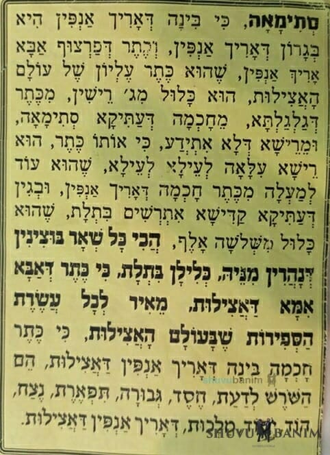 Ribono shel Olam ā Master of the World, Who can do anything, in the merit of the Ben Ish Hai, whose yahrzeit falls on 13 Elul, who merited to that Atika (Ancient One) which is found in three heads, and are included in one head, and that lofty head is above, above, and because that Atika Kadisha (Holy Ancient One) is registered in three, so too all the remaining lights which illuminate from it are included in three, because the Rav HaGaon Yosef Hayim ztzukāl, who was the only one of all generations who merited to the Resha dāla Ityeda (Head which is not Known), to the Keter dāGalgalta (Crown of the Skull), to the wisdom (Chochmah) of the Atika Stimaāa (Concealed Ancient One), because understanding (Binah) of Arich Anpin (the Long Face) is in the throat of Arich Anpin, and Keter of the Divine Persona of Arich Anpin, which is the highest Keter of the world of Atzilut, it is made up of three heads, from Keter dāGalgalta, from Chochmah of Atika Stimaāa, and from Reisha dāla Ityeda, because that Keter is the highest head, above, above, that it is still higher than the Keter of Chochmah of Arich Anpin, and because Atika Kadisha is registered in three, that it is made up of 3,000, so [too] all the rest of the lights which illuminate from it are included in three, because Keter of Aba and Ima of Atzilut illuminate to all ten sefirot in the world of Atzilut, because Keter Chochmah Binah of Arich Anpin of Atzilut are the root of Daāat, Chesed, Gevurah, Tiferet, Netzach, Hod, Yesod, Malchut of Arich Anpin of Atzilut.