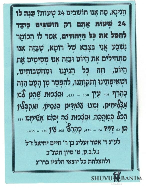 Ribono shel olam, Master of the World, who can do anything and from whom nothing is lacking. The whole time that we are in the galut (exile) amongst the nations, please save us from anti-semitism, and the hatred of the non-Jews. And do with them only good, and by way of this, [they will] draw close to serving You, worshipful One, day and night. And then the Torah will be learnt day and night, and by way of this, we will enter Gan Eden with our bodies. As it says in the Gemara, in Tractate Pesachim, page 87: That a priest asked Rebbe Hanina, what are we thinking about, 24 hours a day? [Rebbe Hanina] responded, For 24 hours a day, you are only thinking about how annihilate all of the Jews! The priest answered him, I swear, I am in the Roman army, and we start the day with this, and we finish the day with this, and this is all of our preoccupation and thinking, and our aspiration and hope, how to get rid of this nation, in the blink of an eye.And in the merit that they don't succeed, and that we continue to stand up in this test, and that we accept everything with love, in the merit of this, Moshiach ben David should come in the blink of an eye.