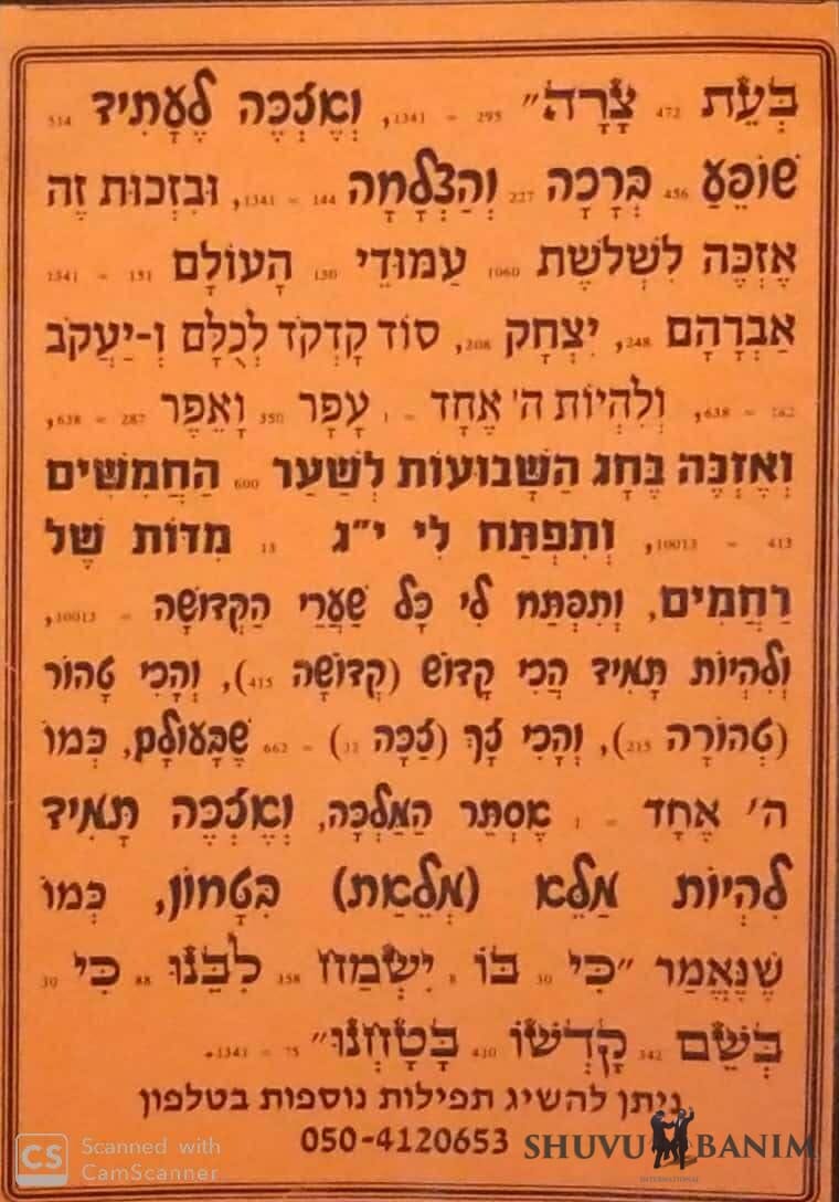And fulfill in me the verse, âThe heavens (395) opened (544) and I saw (213) visions (647) of G-Dâ (86) = 1885. âAnd you (412) Hashem (26) who answers (136) in time (472) of distress (295)â = 1341. Grant me the merit in the future (514) to give off (456) blessing (227) and success (144) = 1341, and in this merit let me have the three (1060) pillars (130) of the world (151) = 1341, Avraham (248), Yitzchak (206) the secret of âKudkod (skull) to all of themâ and Yaakov (182) = 638, and to be, One G-d = 1, dust (350) and ashes (287) = 638. And grant me the merit on the holiday of Shavuot the fiftieth (413) Gate (600) = 1013, that You open for me the thirteen (13) measurements or mercy, and open for me all the gates of holiness (1013) to always be the holiest (415), purest (215), and most refined (32) = 662 in the world like, One G-d = 1, Queen Ester. And grant me the merit to always be filled with trust (in Hashem) as it says: âBecause (30) in him (8) our hearts (88) will rejoice (358) because (30) in his holy (410) name (342) we trusted (75) =1341.====