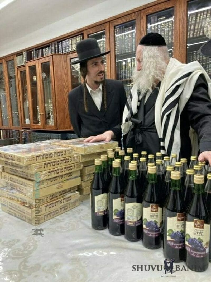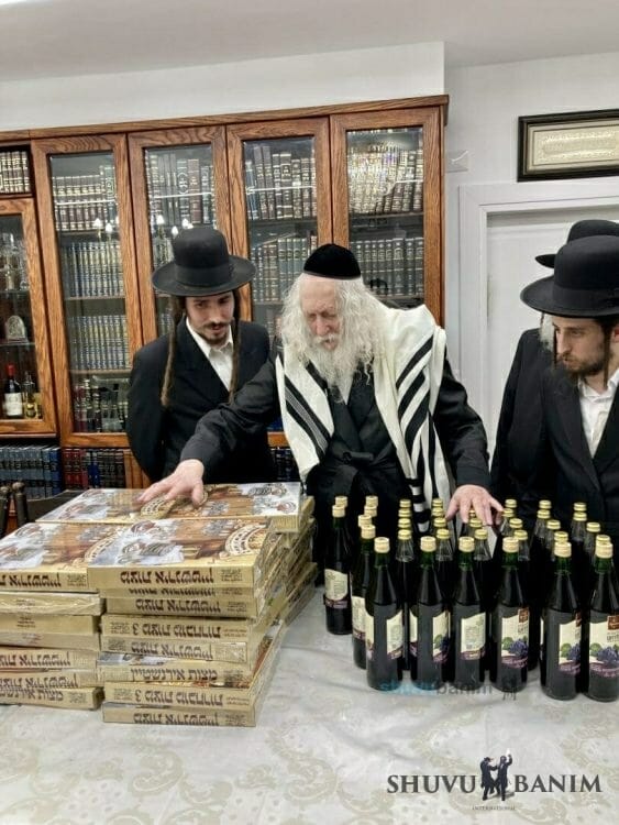 Like every year, also this year the "HaBen Yakir Li" organization, under the auspices of Rabbi Yehudah Kadosh, provides matzas and wine for families of widows and orphans of the Shuvu Banim community. Last night, on Tuesday 6 Nisan, the heads of the organization came to our Rebbe Rav Eliezer Berland shlit"a so that he could bless the matzas and wine for the four cups of Seder night.