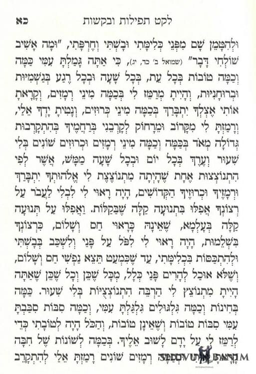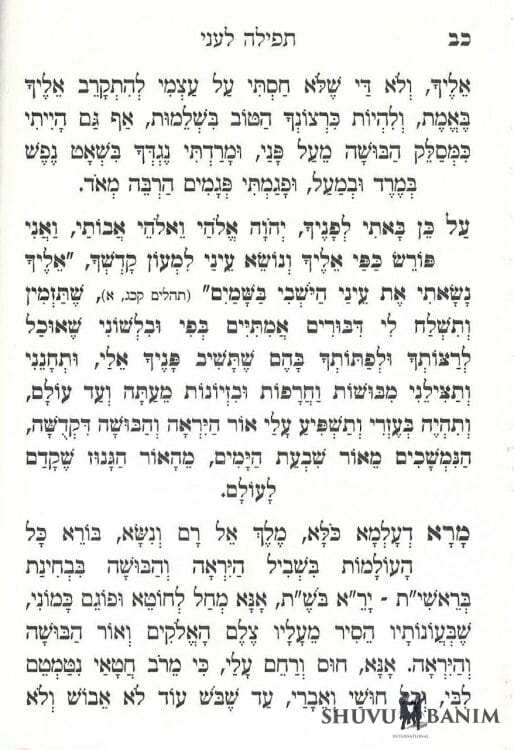 Ribono Shel Olam â Master of the World, King of Glory, Who sees the insult of the insulted, Who has compassion for the honor of His creatures, Who has mercy on all of His works -- have compassion, mercy, and pity, with Your true pity and mercy on the greatness of my disgrace, embarrassment, and shame [which are] extremely great, without measure, value, or number, as You alone know my disgrace, shame, and embarrassment. What shall I say? What shall I speak? How can my face ascend before the King? How will I be able to hide from my shame? How will I be able to conceal my face in the world of truth from my embarrassment? How will I be able to raise my face, blackened more than the brims of a cauldron before You. Hashem, my G-d and the G-d of my forefathers, how will I raise up my face before my forefathers who I came to the world through? How will I raise up my face before my masters and teachers who instructed me on the straight and true path. And I didnât spare their great and holy honor, and I degraded myself and also them, as it were. Who can save me then from my great shame? Who can stand before my terrible embarrassment? How can I find for myself a place to flee and to hide there because of my embarrassment, shame, and disgrace â âWhat shall I answer to the One Who has sent me?â (II Shmuel 24:13), because You endowed me with so much good at every time, every hour, and every moment materially and spiritually, and You would hint to me with so many types of allusions, and You have summoned me [to be] next to You, Blessed One, with all types of appeals, and You have inclined Your hand to me, and alluded to me, from close by and from afar, to draw me close, in Your mercy, with very great closeness with so many different hints and appeals, without measure and count, every day and every hour mamash, that by the measure of one illumination which You shine to me Your G-dliness, Blessed One, and Your holy allusions and appeals, it was fitting for me to never transgress Your will even with the slightest movement. And even over a slight, insignificant movement which isnât fitting, G-d forbid, completely according to Your will, it was fitting for me to fall on my face and lie down in my shame and to cover myself in my embarrassment, until my soul would almost go out, G-d forbid, and that I shouldnât be able to raise up my face at all. All the more so, and all the more so that You would shine to me many illuminations without measure. How many aspects and how many incarnations You incarnated with me, and how many reasons You revolved with me â good and not good reasons, and everything was for my good, in order to allude to me through them to return to You. With how many languages of affection You called to me, and with how many different hints You alluded to me to draw close to You, and itâs not enough that I didnât have compassion on myself to draw close to You in truth, and to be according to Your good will completely, I was even as if removing the shame from my face, I rebelled against You with contempt, with rebellion and misappropriation, and I caused many, many blemishes. Therefore, I have come before You, Hashem my G-d and the G-d of my forefathers, and I spread my hands out to You, and raise my eyes to Your holy dwelling â âTo You I have raised my eyes, Dweller in the heavensâ (Tehilim 123:1), that You summon and send me true words in my mouth and on my tongue so that I can placate and lure You with them, that You will return Your face to me and endow me and save me from shame, disgrace, and degradation from now and forever, and You will be to my aid and endow me with the light of holy fear and shame which are drawn from the light of the seven days, from the concealed light which preceded the world. Master of the whole world, King, exalted and lofty G-d, Creator of all the worlds for the sake of fear and shame in the aspect of BREiShYT [In the beginning] â [which are the letters of] YaREi BoSheT [Fear-Shame]. Please, forgive a sinner and blemisher like me, in whose iniquities he removed from himself the image of G-d and the light of shame and fear. Please, have compassion and mercy upon me, because through my many sins my heart has become stupefied, and all my senses and organs, to the point that Iâm no longer ashamed or embarrassed, and all my blood is boiling within me for every forbidden thing and forbidden thought. And all the disgraces in the world wouldnât be enough to cleanse and purify the blood and to atone for the sins in which I have stumbled, even for the most minor sin, all the more so for my iniquities which have multiplied beyond count, and for my sins which have multiplied beyond number, more than the hairs on my head, greater than the sand of the sea, and heavier than the dust of the earth. And even if all the lakes were ink, and the trees pens, and people scribes, they couldnât write, in all the days of the world, even a tiny, tiny bit of the greatness of my sins, iniquities, rebellious sins, and deliberate sins, which donât stop for even a tiny moment, rather they multiply from day to day, and renew each time the power of the kingdom of evil. Please, let us merit to return from the evil of our iniquities and to be embarrassed by the murkiness of our deeds, to confess our rebellious sins and to draw onto us the loftiest shame, which is the root and genesis of the entire creation, an aspect of Yarei Boshet â Fear-Shame, and let us merit to be ashamed and embarrassed every moment and second, and from the power of the fear and shame to praise You with every single breath.