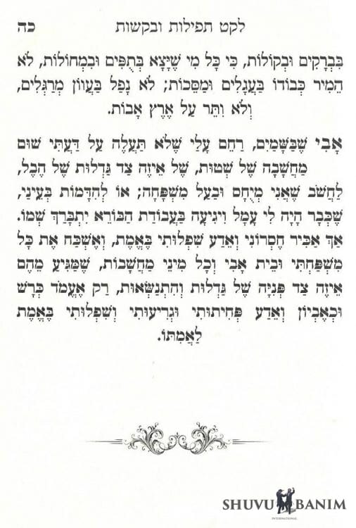 Ribono Shel Olam ā Master of the World, Merciful Father, let me merit to be purified and refined from every residue and blemish of haughtiness, from any tiny hint of superiority and arrogance, from any trace of pride, because Iām in great distress; I am a prisoner of lust and a captive of pride, which surrounds me from foot to head, to the point that I cannot learn and pray with serious-mindedness, because āan abomination to Hashem is every haughty heartā (Mishlei 16:5); in my self-importance, my senses have become dimmed, and I am uncircumcised in heart.Ā Because it was fitting that the fear, lowliness, and humility within me would increase with every single letter of Torah and prayer, and that my learning wouldnāt cast me, G-d forbid, into haughty-spiritedness, an evil eye and gratuitous hatred for every being. Please, Merciful Father, Creator of all heavens, see now the sorrow of one from whom all the upper worlds have been erased, who penetrates and breaks through all the abysses, who disputes true Tzaddikim, sustainers of worlds.Ā Please, help me to nullify corporeality.Ā Graciously endow me with the trait of humility, through song and dance of joy.Ā If only I would merit to the song of Barak and Devorah, who brought salvation, and to the song of the sea, which brought down Torah with lightning and thunder, because anyone who went out with drums and dancing didnāt exchange His glory with calves and idols, didnāt fall in the sin of the spies, and didnāt concede the land of the forefathers. My Father in Heaven, have mercy upon me that no thought of nonsense, of any aspect of vain self-importance should enter my mind, to think that Iām of distinguished lineage, or head of a family; or to imagine in my eyes that I already have had toil and exertion in serving the Creator, may His name be blessed.Ā Only that I will recognize my lack and know my lowliness in truth, and forget my entire family and fatherās house and all types of thoughts which result from them some type of cause for self-importance and arrogance; Iāll only stand like a pauper and like a poor person, and know my inferiority, inadequacy, and lowliness in absolute truth.