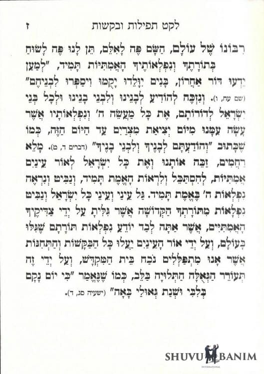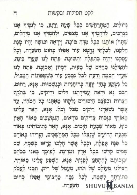 Ribono Shel Olam â Master of the World â Who revives the dead with abundant mercy, Living G-d and King of the World. Have mercy upon us, revive us and sustain us, sanctify us and purify us from the impurity of the dead, which is the father of fathers of impurity, until theories of natural cause and effect will be subdued and nullified, since from there is the hold of the Sitra Achra (the Other Side â i.e. the side of evil), and let us merit to believe in Your holy miracles, in the exodus from Egypt and in the splitting of the Red Sea, [that] we will believe that everything behaves through Your wondrous divine providence with no natural means whatsoever, that everything is conducted in a way so that Your uniqueness and unity will be revealed in the world. Then You will do with us miracles and wonders for good; You will shed two tears into the Great Sea and put a total end to all the idolaters who are persecuting us. We will sing a new song to You about our redemption and the redemption of our souls, a song of divine providence, a song of wonders. Merciful and Gracious â Please, hear our prayers, donât toss us away from before You in old age. In the end of generations, hurry please to redeem us, and show to us wonders and salvations, and our eyes shall behold great miracles which happen at every hour and moment; because we need Your miracles, we await Your mercy, we long for Your kindness, that You should grace us with every good trait, and that fear and contrition should be our portion, that we shouldnât sin again â even a hairsbreadth â and all our involvement will be in prayer and repentance. Open for us gates of understanding, to save us from a life of error, delusion, and disappointment. Open for us gates of wisdom and knowledge, that we should no longer drown in floods of the deluge, to not sink into a life [thatâs] abhorrent spiritually and physically. Please, Merciful, look now and see our poor and destitute state, because on account of the distress and the harshness of the suffering, all the mochin (mentalities â i.e. intelligence) have been taken from us to the point that we have been left empty of everything. Please, shine Your light upon us in the merit of awesome Tzadikim who are drawn from the light of Ain Sof (the Infinite), from the light of the Seven Days [of Creation]. Please, illuminate our way with the light of the Seven Shepherds who were saved from all darkness, who illuminate with their light every dark corner, and in everything they did they called in Your Name; the Name of heaven they sanctified in every land and nation. Therefore, we come through their power and in their merit to plead before You. Please, bestow upon us from Your light, save us from a world of chaos, from toiling for naught, and let us merit to engage in Your Torah for its own sake, without straying from Your will even a hairsbreadth. G-d, exalted, uplifted, and abundantly able to save â Save us speedily and redeem us also in this generation, as we are today, even if we arenât worthy of any miracle or change in nature. Even so, nothing is beyond You, and You perform miracles and wonders beyond measure in every single generation and on every single day for the worthy and unworthy when they scream to You in truth and sincerity, and search for the true Tzadik with all their heart and soul â the Tzadik who is an aspect of âand the man Moshe was very humble, more so than any person on the face of the earthâ (Bamidbar 12:3); that he is an aspect of dust and ashes, who threw straw and it turned into arrows, dust and it became swords. And when we reveal a Tzadik like this, then our souls will be precious in Your eyes, and despite us being inadequate â in truth like dust and ashes â save us.  Specifically from the midst of our lowliness and inadequacy, shine Your light for us and redeem us, and fulfill in us: âG-d awoke like one who was sleeping, like a warrior rousing himself from wine. He struck his enemies into retreat, eternal disgrace He gave to themâŚÂ He chose the tribe of Yehuda, Mount Zion which He loves. He built his Temple like the high heavens, like the earth He established foreverâ (Tehilim 78: 65-69). Then You will return and build for us our Temple, and return us to our land, to our holy city, âBring our scattered ones close from amongst the nations. Gather our dispersed ones from the ends of the earth, and bring us to Zion our city in gladness, to Jerusalem, Your Temple with eternal happiness.â Ribono Shel Olam â Master of the World! Place a mouth for the mute. Give us a mouth to speak of Your Torah and Your true wonders always, âso that the last generation will know, children will be born, will rise and tell their childrenâ (Tehilim 78:6). Let us merit to make known to our children, and to our childrenâs children, and to all the children of Israel for their generations all Hashemâs works and wonders which He has done for us from the day of the exodus from Egypt until this day, as itâs written, âYou shall make them known to your children and to your childrenâs childrenâ (Devarim 4:9). Full of Mercy â Let us and all Israel merit to the true light of the eyes, to look and see the truth always, and we will glance and see the wonders of Hashem in truth, always. Open my eyes and the eyes of all Israel [so that] we shall see the wonders of Your holy Torah which You revealed through Your true Tzadikim â that You alone know of the wonders of their Torah which they revealed in the world; and through the light of the eyes, all the requests and supplications which we pray opposite the Holy Temple will ascend, and through this the redemption, which is dependent on the heart, will be aroused, as is written, âBecause a day of vengeance is in My heart and the year of My redemption has comeâ (Yeshayahu 63:4).