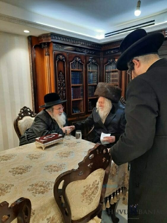 Our Rebbe Rav Eliezer Berland shlit"a visited his close friend the Rebbe of Spinka-Dolono at his home in the city of Torah, Bnei Brak. Because of a family celebration in Bnei Brak, Rav Berland shlit"a took the opportunity to visit the Rebbe, who was very moved in seeing him and seated him at the head of the table. The two Tzaddikim spoke at length words of Torah and Agadah.