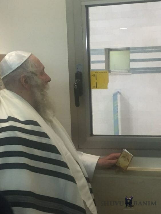 Rav Berland reciting tehillim outside his brother Yehezkel's hospital room yesterday.[/caption]