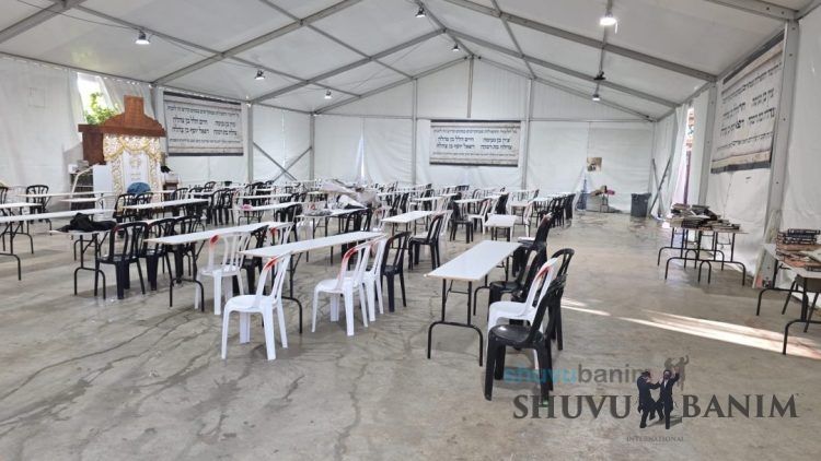 As is well known, in the past two years, Moreinu HaRav shlit"a was accustomed to going to the Kotel on the night of Simchat Torah to hold the holiday prayers and hakafot there. This year, due to the medical condition of the Rav shlitâa, whose leg, for about a month, has been suffering and atoning for the sins of Am Yisrael, the holiday prayers were designated to take place near his holy home. On the eve of Yom Kippur, a prayer tent was erected in an area specially allocated for the Shuvu Banim community. However, due to the Ravâs health condition, the prayers were ultimately held from his balcony. During the Sukkot holiday, all prayers and activities held in our Beit Midrash were transferred to the "Prayer Tent." Now, on the eve of Simchat Torah, Moreinu HaRav shlit"a expressed his desire to come, for the first time, to the "Prayer Tent" to hold the prayers and hakafot for Shemini Atzeret. For this purpose, bleachers were set up along the entire tent, and for the womenâs section, the adjacent road segment at the Neviâim-Damascus Gate intersection was closed. In honor of Moreinu HaRav shlit"a, a raised platform was prepared so that he could be seen even from the other side of the aforementioned intersection.