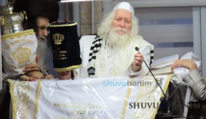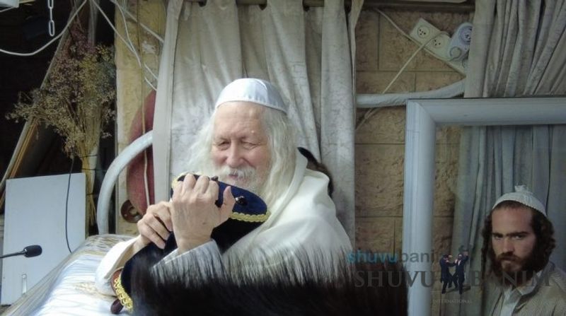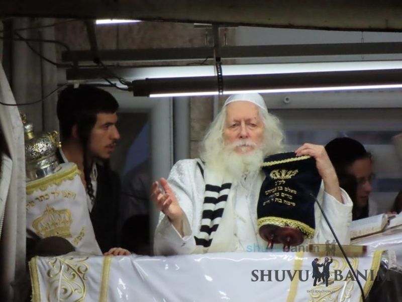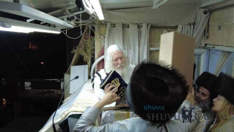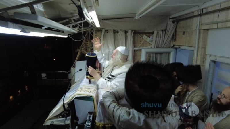 At 6:17 am, the Rav shlit"a came out for Shacharit of Simchat Torah. The prayer was like every Shabbat and Chag, with niggunim and great arousal. At around 8:15, while saying Hallel with niggunim, the missile alarm began to shriek throughout Jerusalem, but because of the song and niggunim, they couldn't be heard. Only the echo of the explosions of intercepted rockets were a sign that something was taking place. At 10:00, Hallel was concluded, and the Rav shlit"a announced that each person was to have an aliyah to the Torah, and that he would come out after two hours to read the Torah and for Musaf. After Hallel, a bit of the terrible news began to trickle in, mainly because of the draft of reservists which was taking place nearby in the Musrara neighborhood. For the remainder of Simchat Torah, the Rav shlit"a remained closed in his room and did not come out for the rest of the prayers of the Chag. Only at the conclusion of the Chag, at 8:00 pm, the Rav shlit"a came out for the Ma'ariv prayer and Hakafot Shniyot. After more than three hours of dancing in order to sweeten the harsh decrees from the Jewish people, the Rav shlit"a gave over a shiur about the level of the holy and pure martyrs who fell for the sanctification of God's Name.Photo Gallery from the conclusion of Simchat Torah: