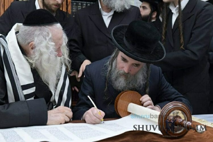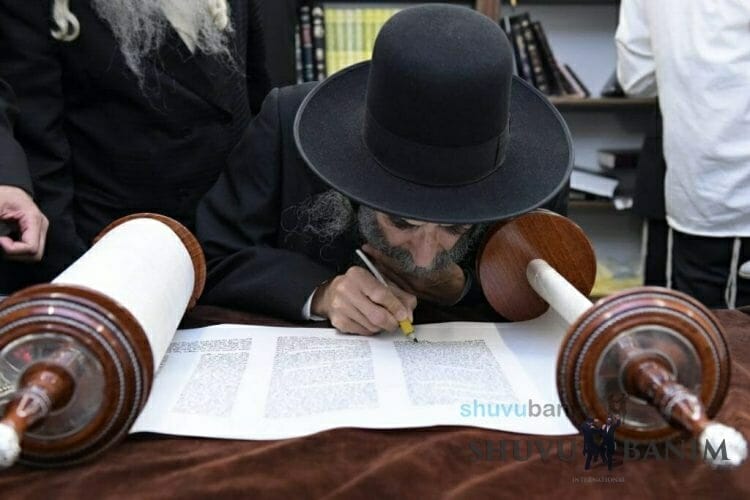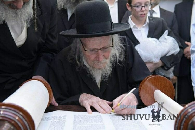 On Tu BâAv evening, the Rabbis of the community entered Rav Berlandâs holy dwelling with a new Torah scroll in their hands for the event of finishing the writing of the final letters of the Torah scroll. In the living room of his home, the Rav shlitâa wrote the last letter of âin the eyes of all Israel,â and afterwards the Rabbis of the community continued and finished additional letters.