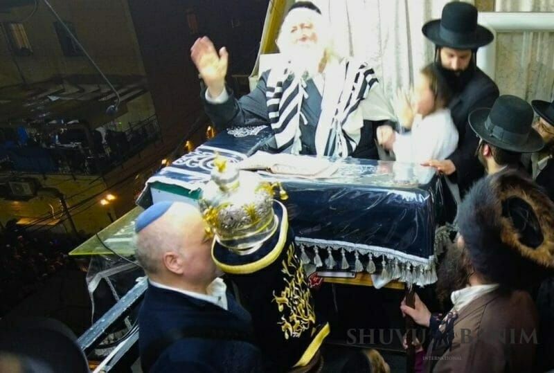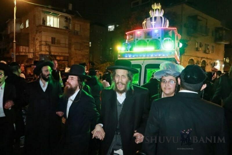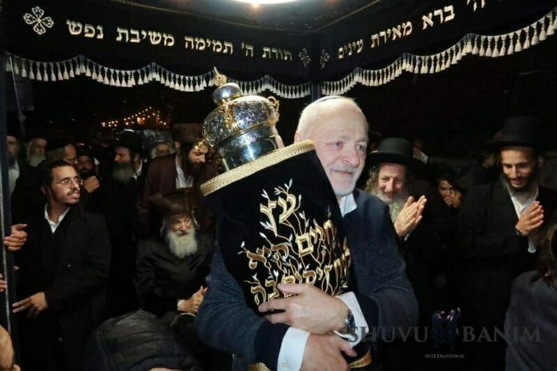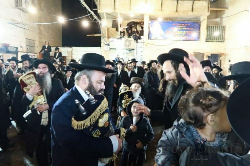 In spite of the heavy rainfall, the procession left on time from the home of the Rav shlit"a on Rechov HaHoma HaShlishit 14, towards our Beit Midrash on Rechov Ido HaNavi, with the procession moving along with masses of people, with singing and dancing. In spite of the wintery weather conditions and rain, this didn't prevent hundreds of people from dancing with great simchah in honor of the Torah, with the procession passing through HaHoma HaShlishit, Shivtei Yisrael, Shomrei Emunim, Meah Shearim, until finally reaching our Beit Midrash on Ido HaNavi 14, in the courtyard of the Prayer Hall. There the dancing continued with even greater strength, the Rav shlit"a entering his home's balcony to the song "Or Zarua L'Tzaddik." Together with the Rav shlit"a, the dancing continued with even greater fervor, the giant crowd seeing the Rav shlit"a jump and dance in honor of the Torah like a young man, everyone filled with holy fervor, dancing and jumping. Also during the dancing, Rav Eliyahu Meirav shlit"a entered, despite not being about to walk on his feet, and danced with our Rebbe the Rav shlit"a with self-sacrifice and great simcha in honor of the Torah. After over two hours of dancing in honor of the Torah, with the song "Our Father, our King, open the gates of the heavens to our prayers," the Torah scroll was brought into the ark. The Rav shlit"a then began the Maariv prayer, and afterwards gave over a shiur about the parashah.The video of the Torah scroll dedication and Maariv prayer:
