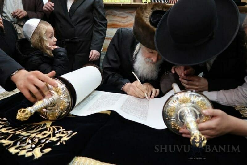 Our Rebbe Rav Eliezer Berland shlit"a writes the last letter in the Torah scroll[/caption]