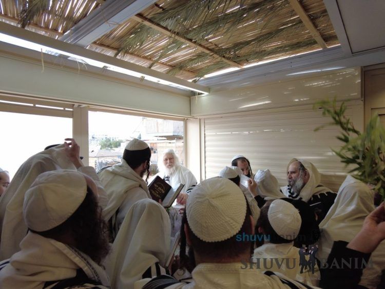 At 8:06, Moreinu HaRav shlit"a blessed "Al Netilat Lulav" under the holy sukkah above him. Immediately afterward, while waving the lulav, he blessed and began singing Hallel – holding the Four Species in his hands throughout the entire Hallel, and, as is his holy custom, he shook them many times to sweeten the judgments and the difficult hours through the waving, which contains hidden and lofty secrets. The entire Hallel was sung with niggunim and tremendous vitality. Particularly striking was the singing of "B’tzeit Yisrael MiMitzrayim" for about 25 minutes, followed by "Hodu LaHashem Ki Tov" for another 25 minutes, with Moreinu HaRav shlit"a pausing while waving the lulav, as is customary. He concluded the extended Hallel with the stirring melody of "Ana Hashem Hoshia Na," which he extended for about 8 minutes.